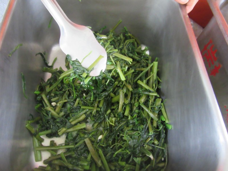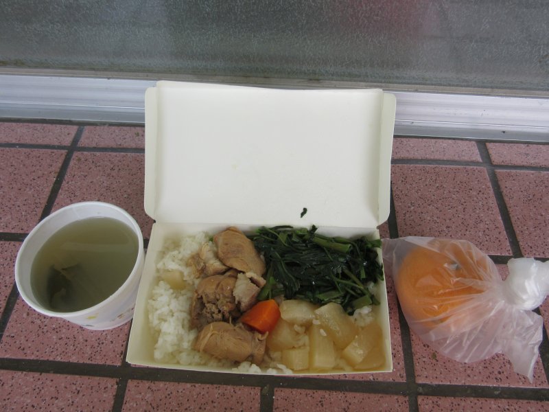 白米飯.洋蔥燒雞.銀蘿肉絲.空心菜.味贈豆腐湯.橘子