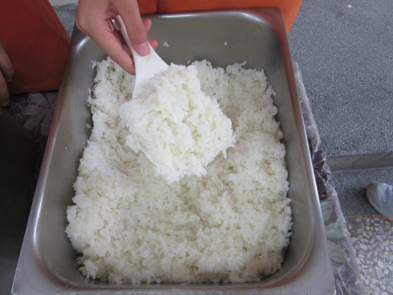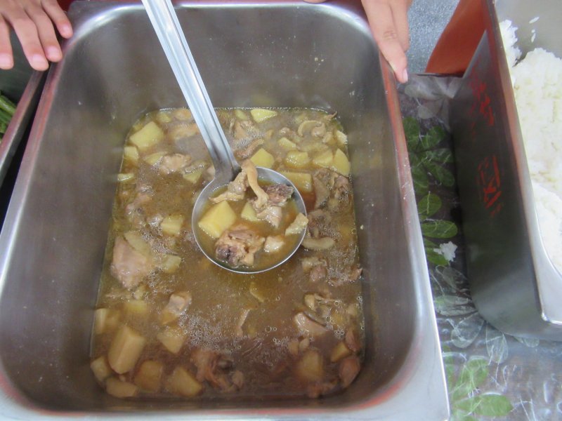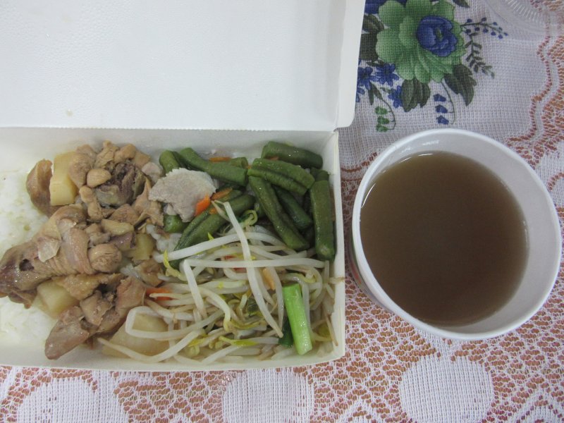 白米飯.洋芋燒雞.翠炒三色.豆芽菜.珍珠麥仁湯