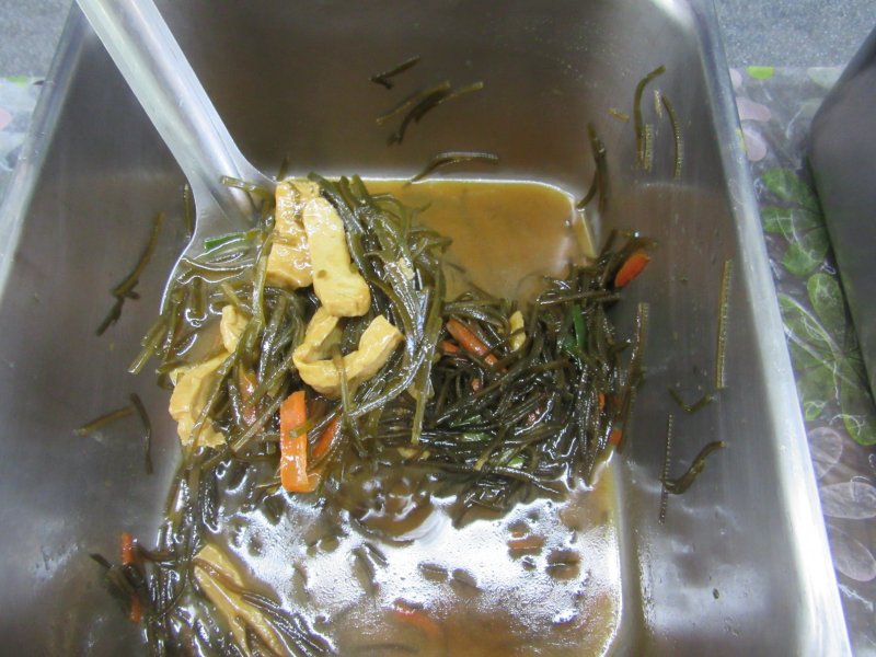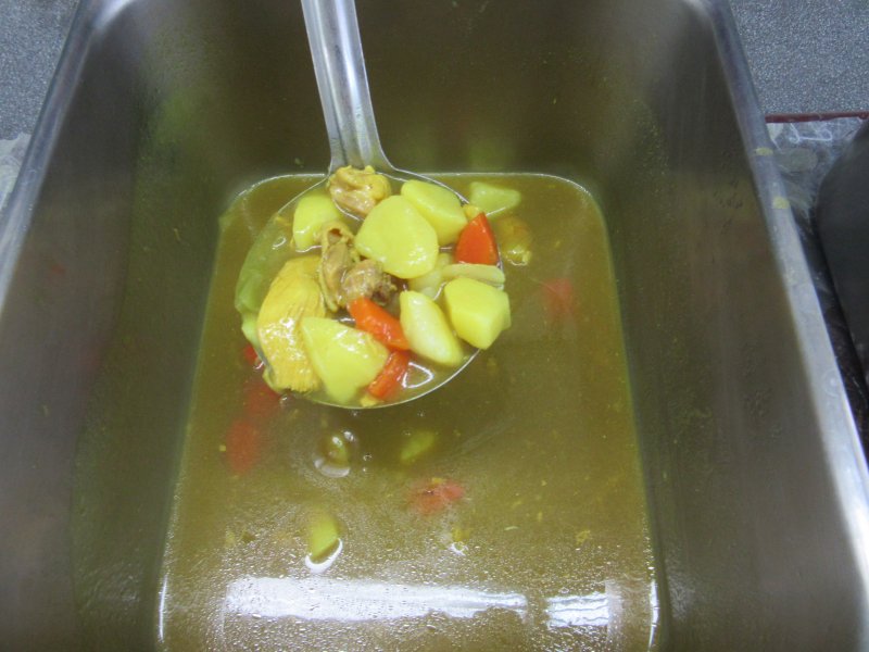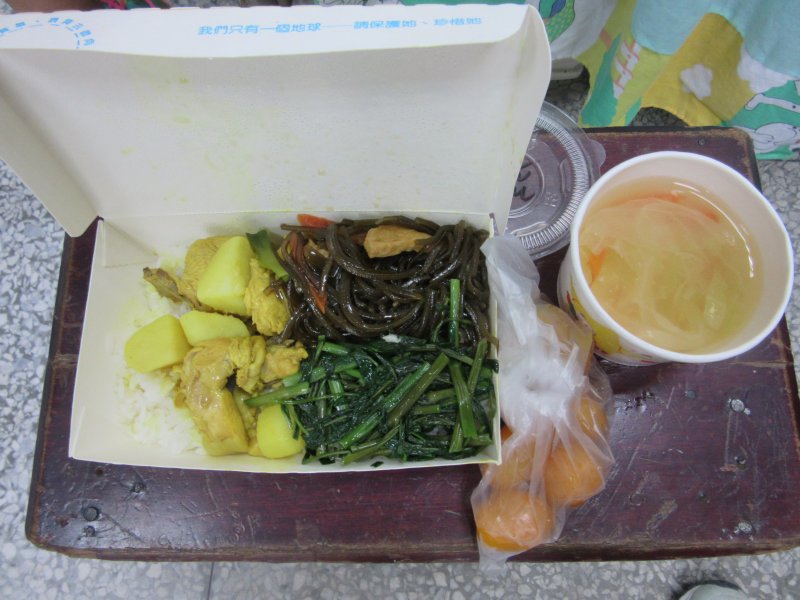 白米飯.咖哩雞.海絲豆干.有機空心菜.小蕃茄.蔬菜湯