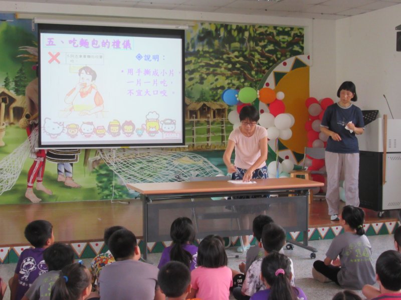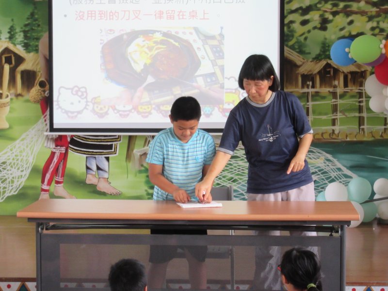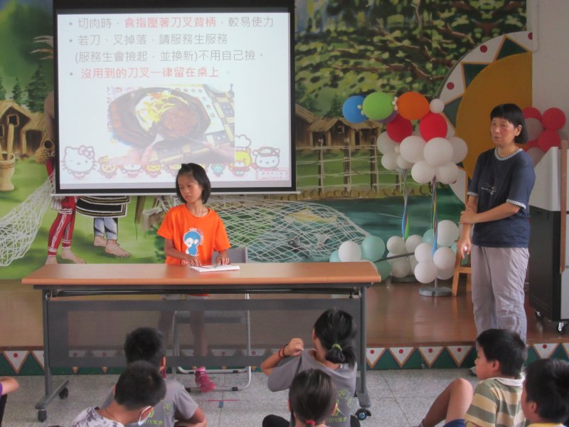 快期末囉!學校辦理[校長請吃牛排】活動,今利用時間與學童宣導吃西餐基本禮儀,從穿著、喝湯、吃麵包、吃牛排時刀叉使用方法,每班派出一位小朋友出來示範,希望大家能吃出健康吃出氣質