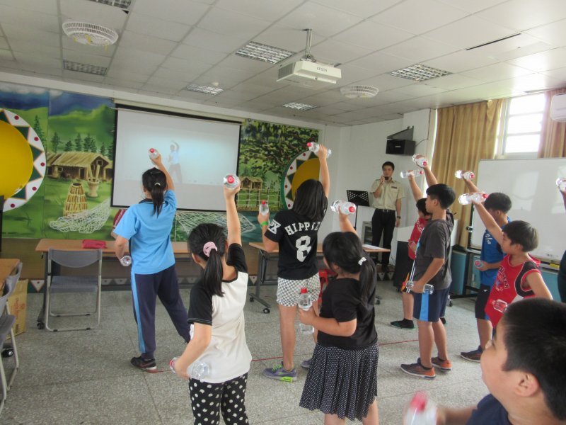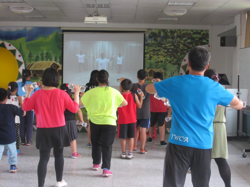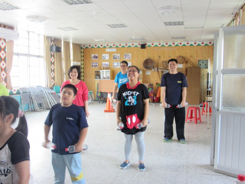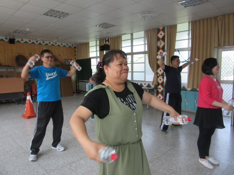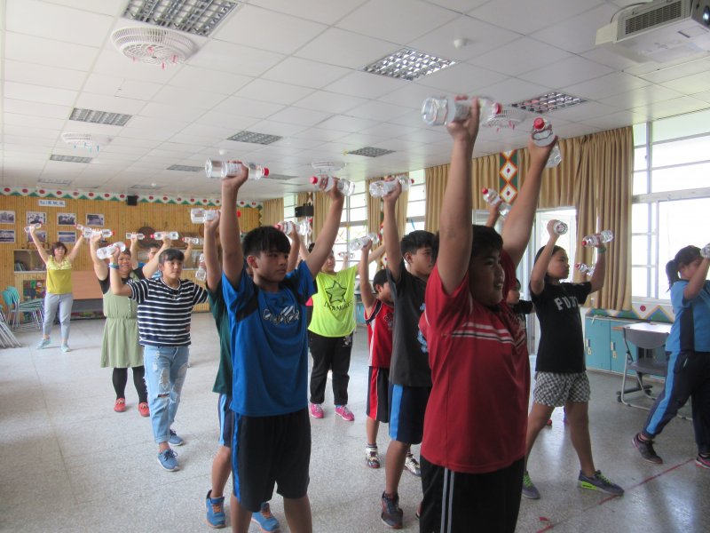 全校塑身班的師生一起跳著花蓮縣衛生局所推廣的啞鈴操,大家卯起來動動身體,流流汗讓心跳加速,好不快活