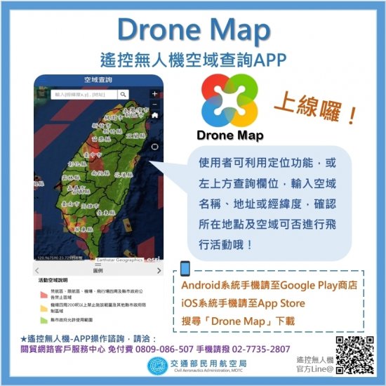 民航法遙控無人機專章自109年3月31日施行,民航局已彙整遙控無人機圖資資料,並匯入「遙控無人機管理資訊系統」,另已建置行動裝置應用程式(DroneMap),搭配地理定位功能,可提供無人機操作者查詢利用。