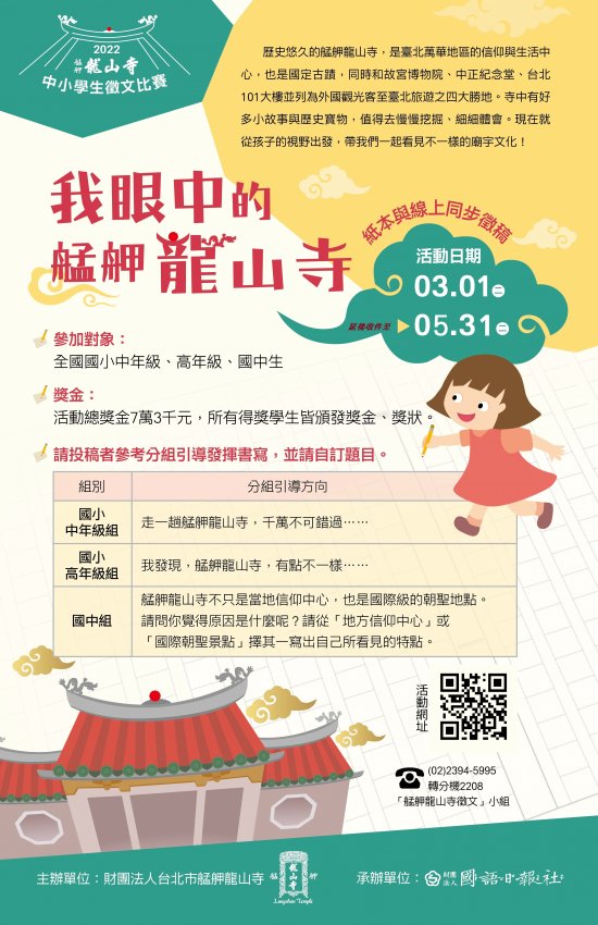 四、 | 「2022艋舺龍山寺中小學生徵文比賽 我眼中的艋舺龍山寺」活動網址https://bit.ly/320t70i 或洽活動專線 (02)2394-5995分機2208。 |