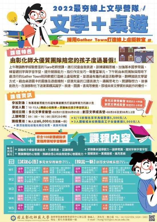 (一) | 課程特色:國立彰化師範大學進修學院採用時下最流行的Gather Town視訊軟體打造線上虛擬教室,並透過有趣的桌遊活動帶領,翻轉國語文學習方式,藉由桌遊圖卡的圖像及遊戲機制,促進兒童的口語表達力、邏輯思考力、閱讀聯想力、故事創造力,在潛移默化下逐漸累積其識字、表達、閱讀、書寫等量能,厚植未來文學賞析與創作的養份。 |