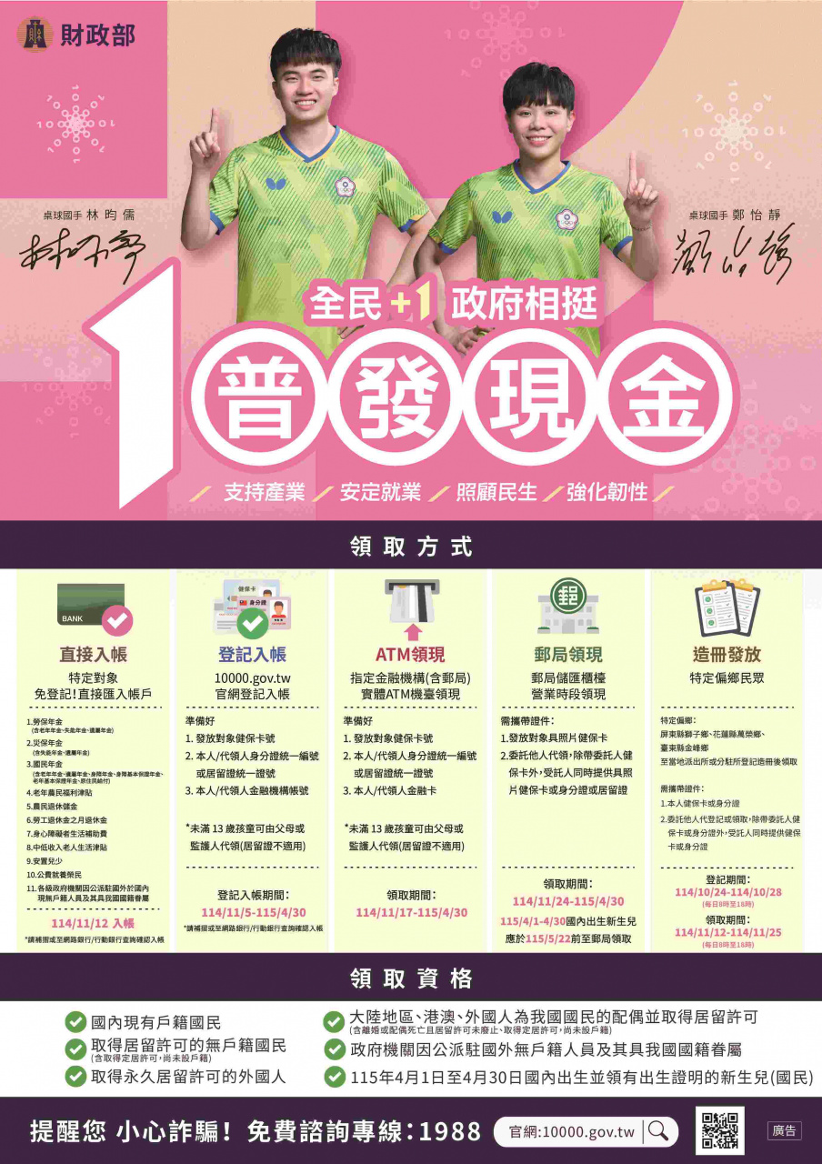 為利民眾即時獲取「全民+1 政府相挺」普發現金1萬元政策資訊,請協助張貼海報宣導,請查照。
